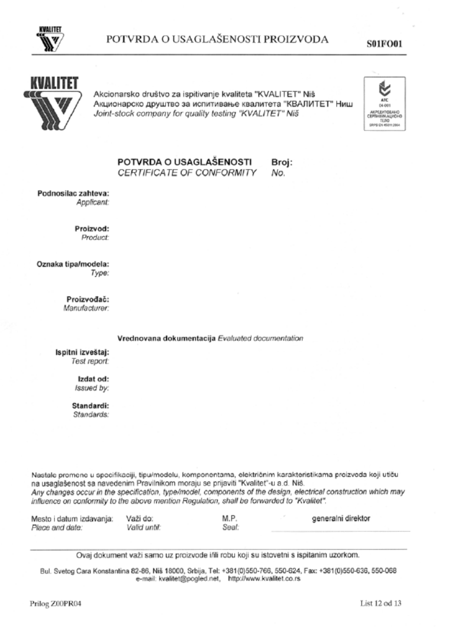 塞尔维亚合格标志的加贴方式及位置由《产品合格标志加贴方式及使用规则》(Official Gazette of RS", No. 25/10)规定。 -